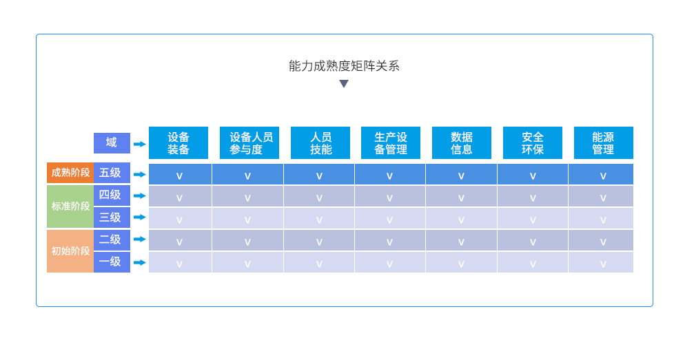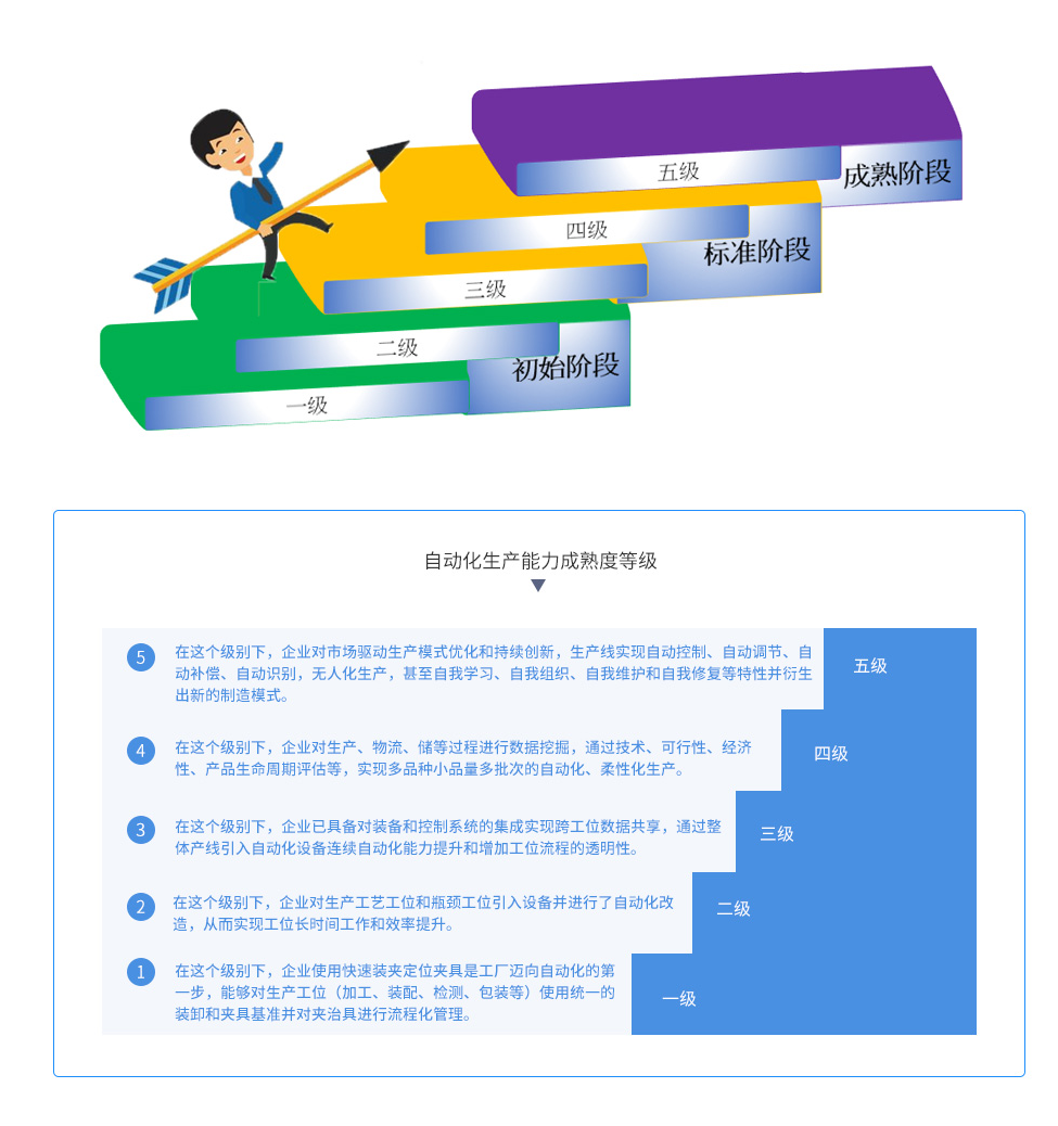 等级是定义了自动化生产能力的水平,描述了一个生产能力逐步向更高制造能力迈进的路径,它代表了当前实施自动化生产的程度,同时也是制造能力评估活动的结果。自动化生产能力成熟度划分为5个等级,数字越大成熟度等级越高。高成熟度等级代表比较强的自动化生产能力。自动化生产能力水平是由低到高逐步递进的,不能放弃比较低的等级直接越级提升到比较高的等级,每个等级向下兼容下一个等级。